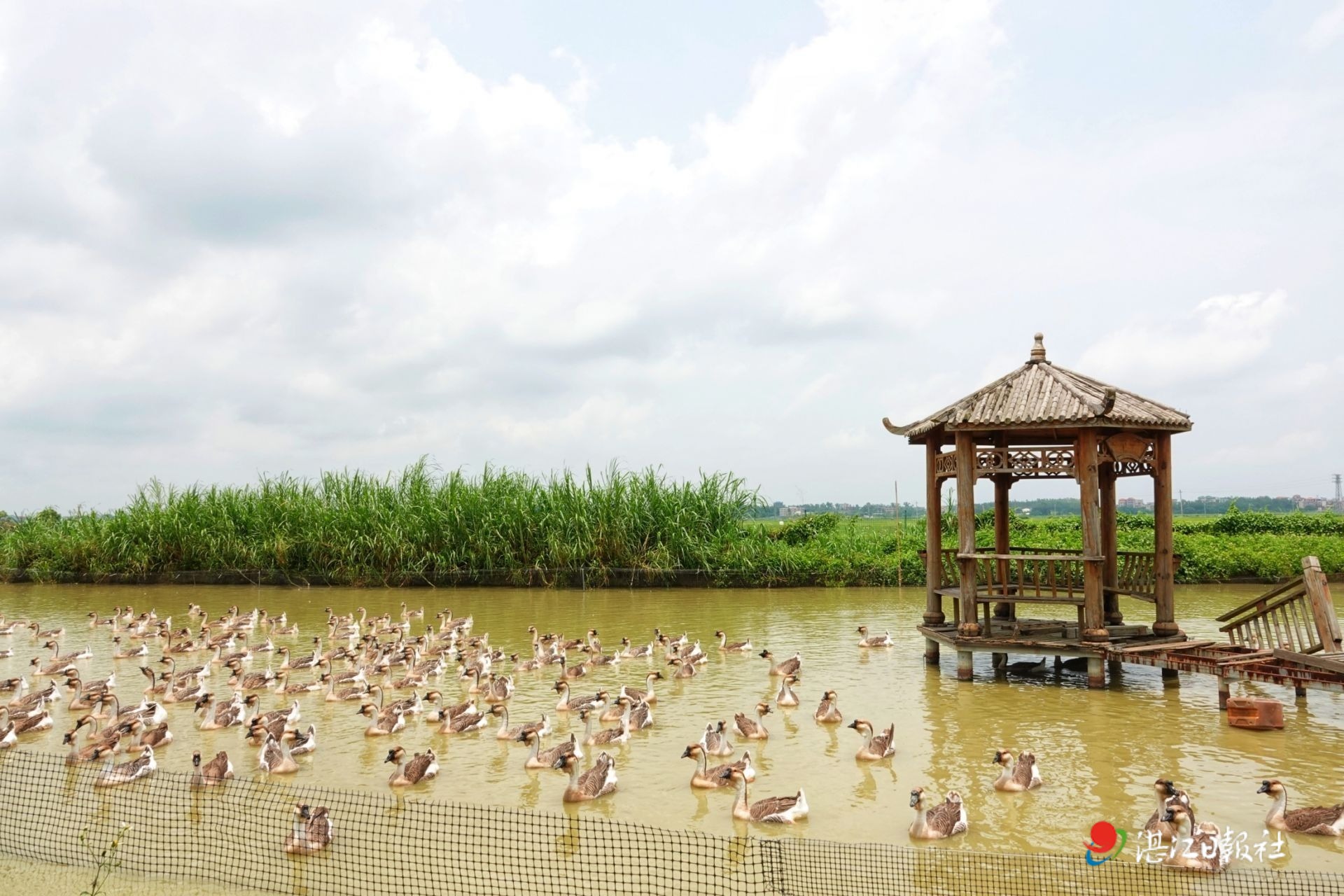樟鋪鎮下村肉鵝養殖基地,一群鵝在水面游弋。