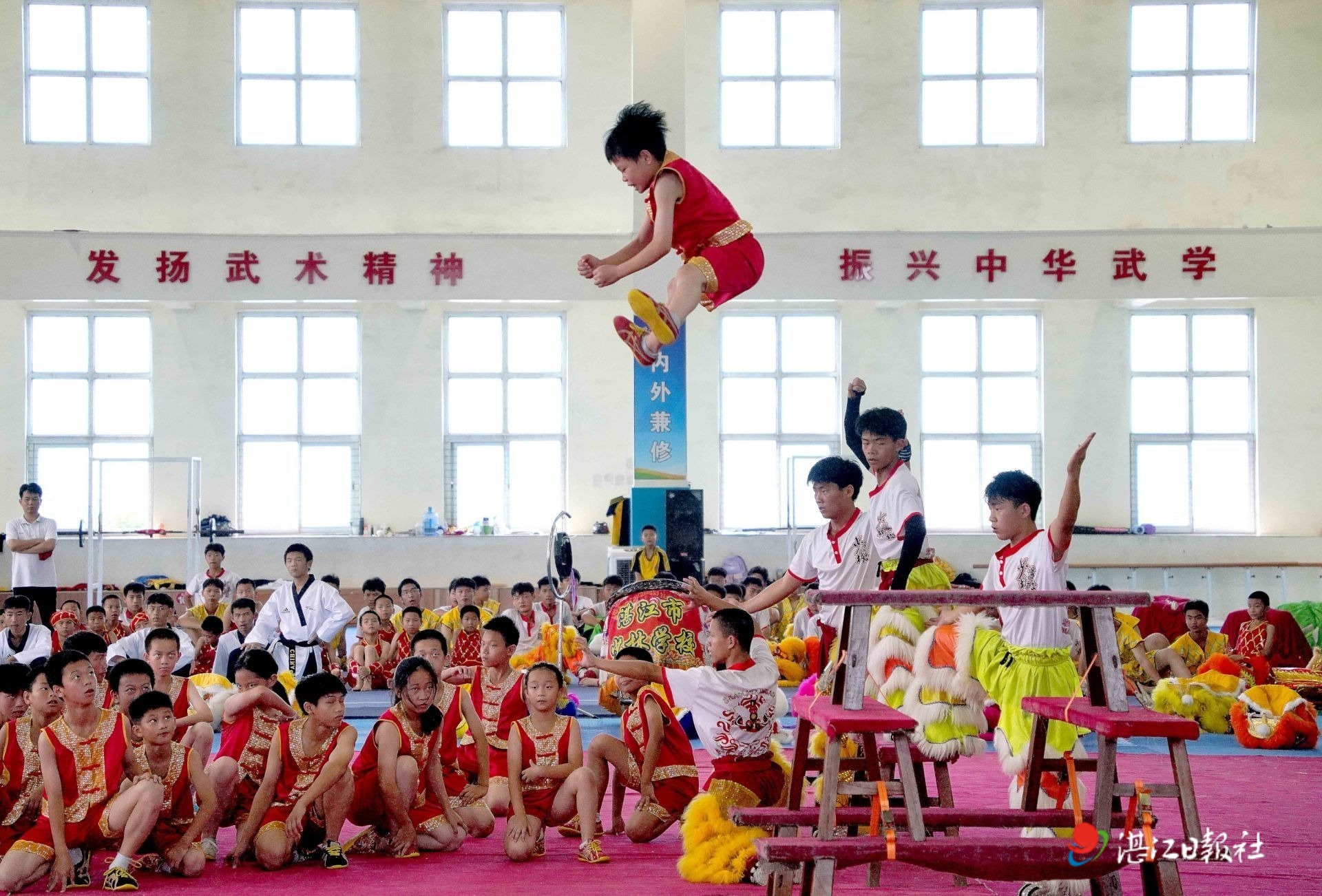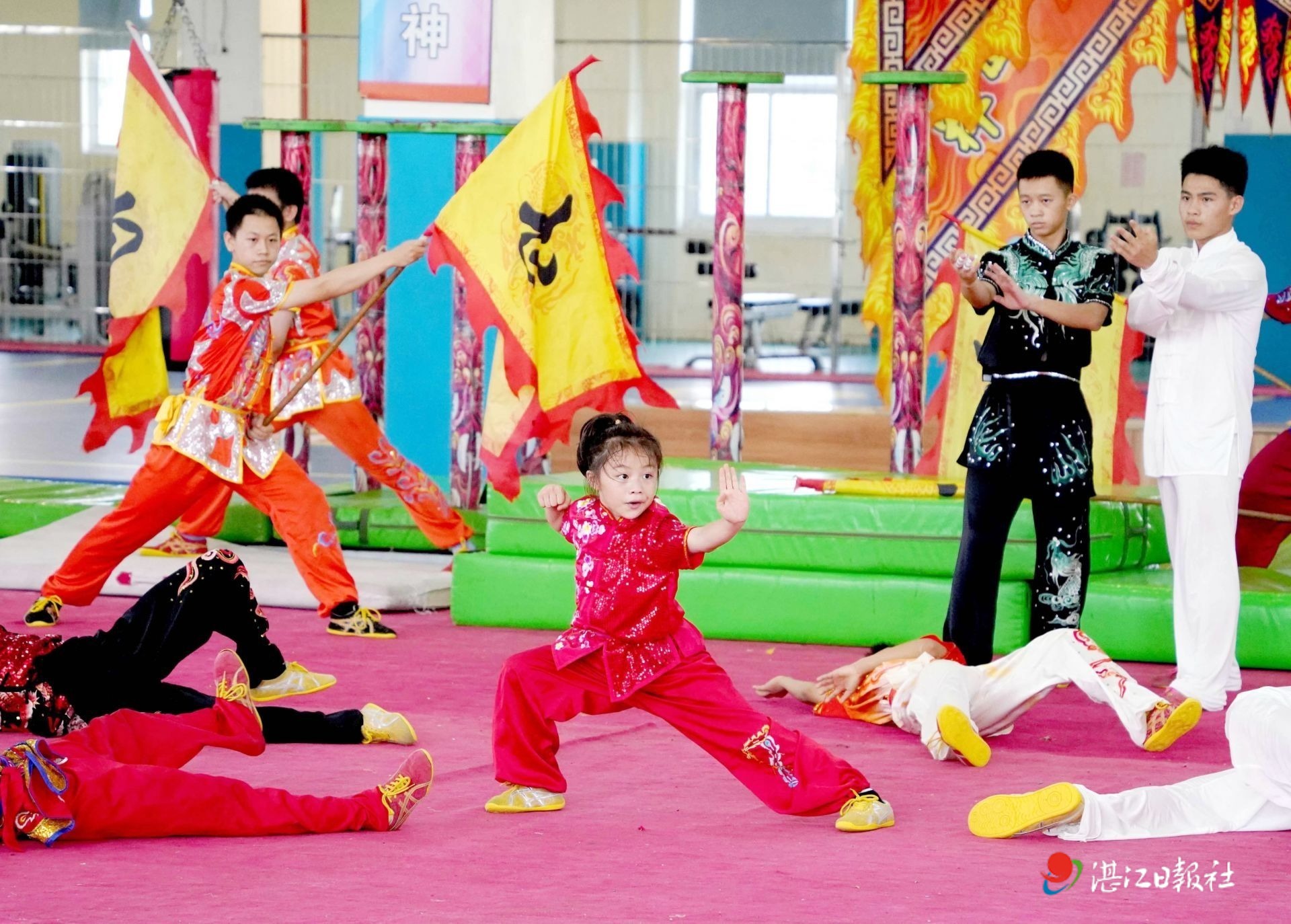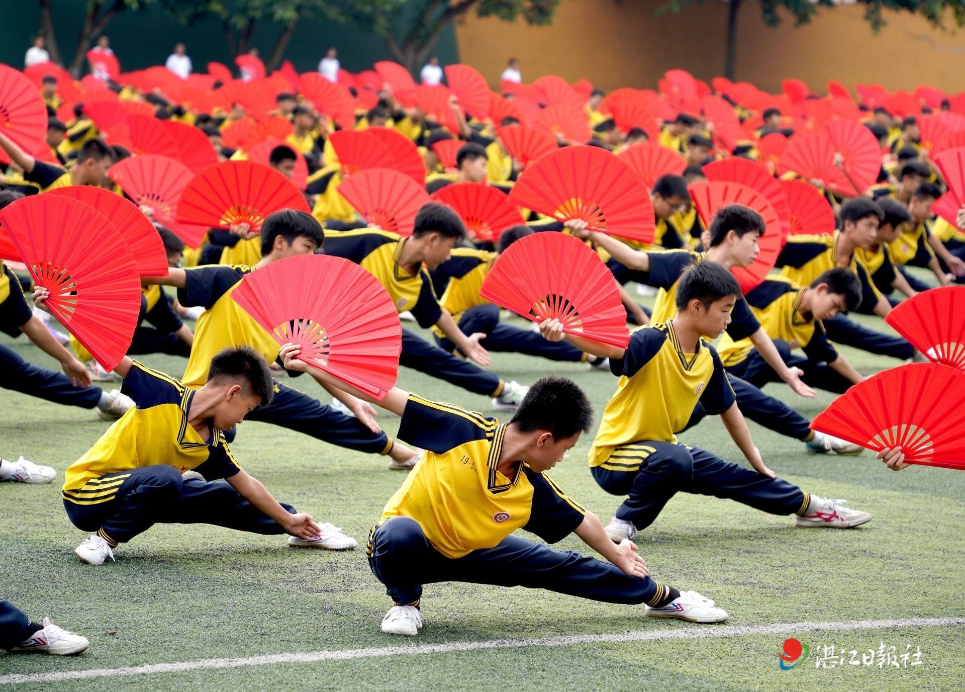 剛勁有力的拳法,矯健靈活的腿腳,隨著課間操音樂響起,湛江市少林學校的學生們身著統一的服飾,做起了整齊劃一的課間操,伴隨著音樂節奏的變換,他們或揮拳,或踢腿,或轉身跳躍,既有武術的陽剛之氣,又不失戲曲的柔美之韻……