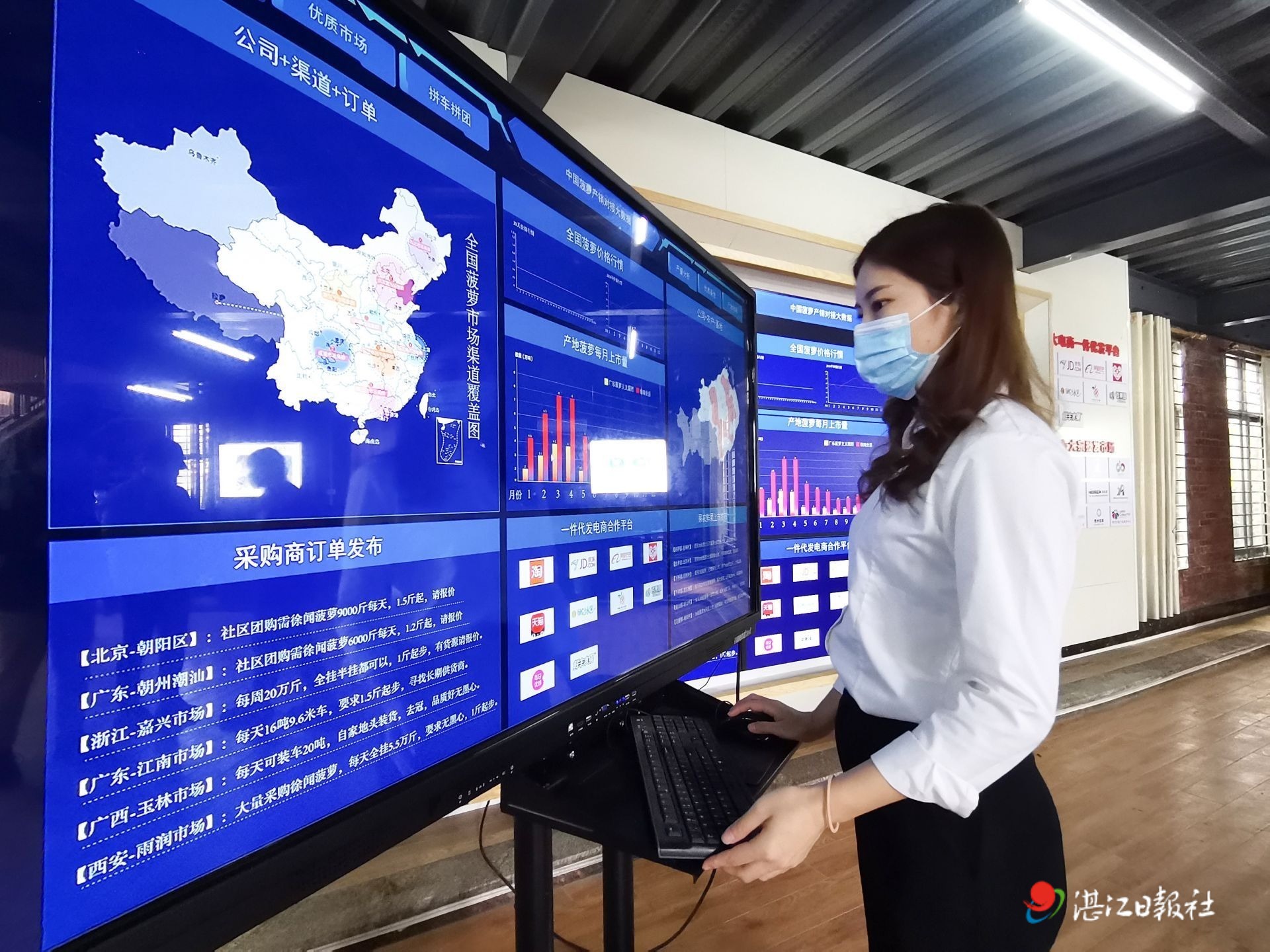 位于徐聞的中國菠蘿電商產地直供基地,工作人員通過中國菠蘿產銷大數據平臺了解菠蘿市場行情。