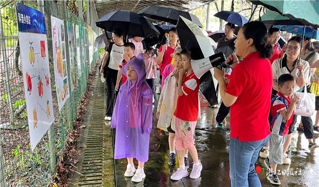 瓢潑大雨也無法阻擋家長和小朋友的熱情,大家撐著傘,跟隨著講解員的腳步,參觀種質資源圃,近距離接觸掛著黃晶果的樹、開著紫色花的楊桃……進行一場與大自然的雨中“邂逅”。在觀看科普視頻的課堂上,大家觀察了火龍果和牛油果的開花習性及牛油果種子的萌發過程;在特異種質資源展示區,近距離觀察形狀各異的果實,驚嘆于手掌大的牛油果;在體驗區,品味香味濃郁的牛油果奶昔,讓人贊不絕口。