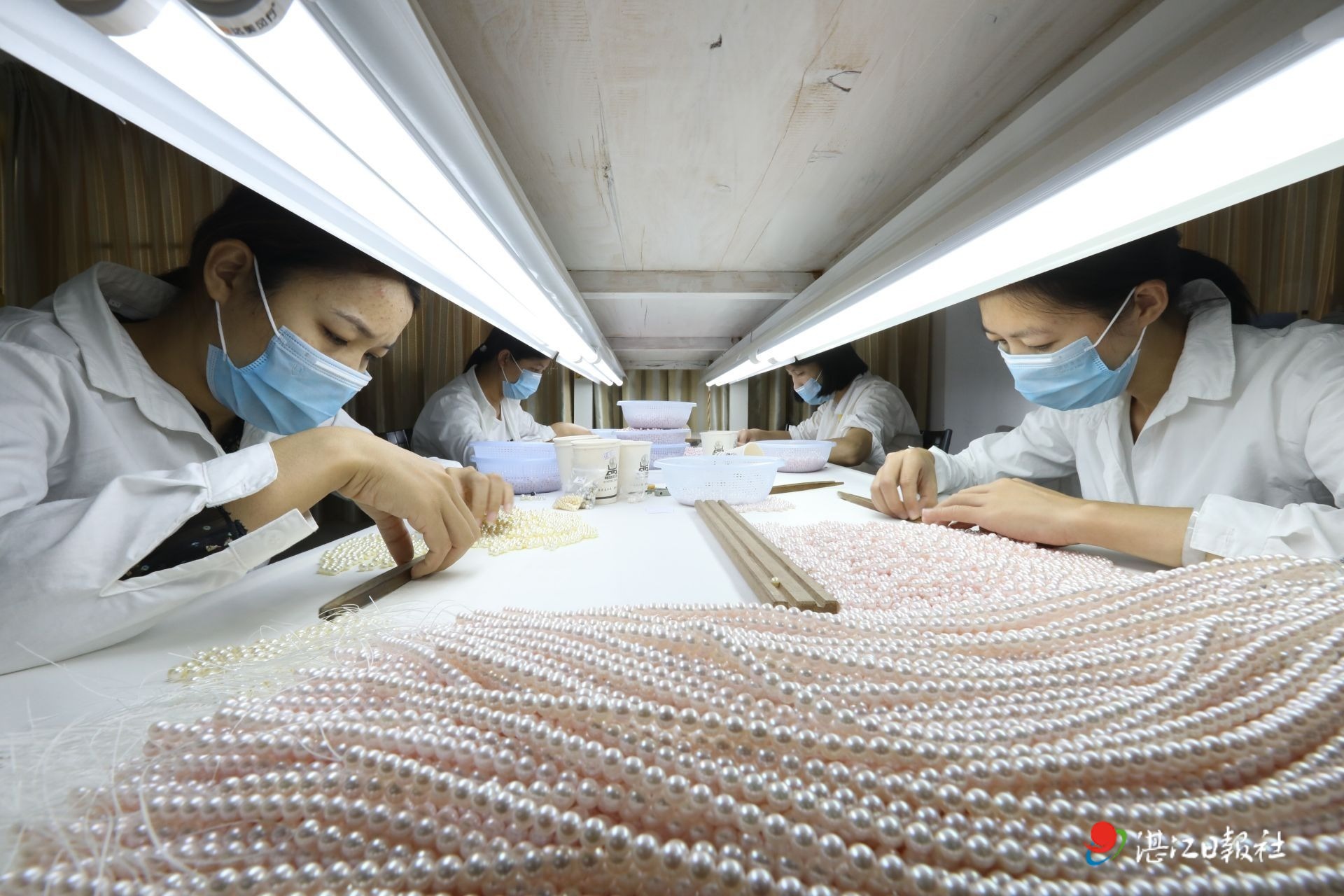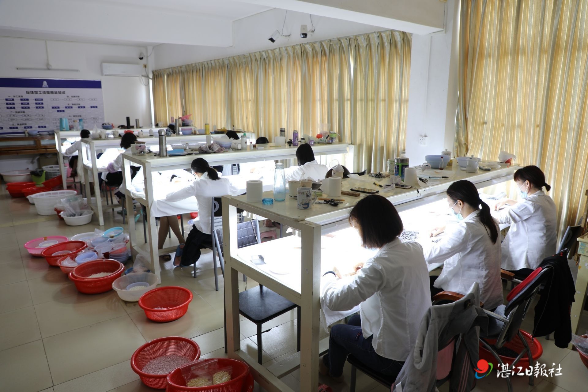 雷州市覃斗鎮(zhèn)流沙港尊鼎珍珠生產(chǎn)基地,工作人員正在加工珍珠。