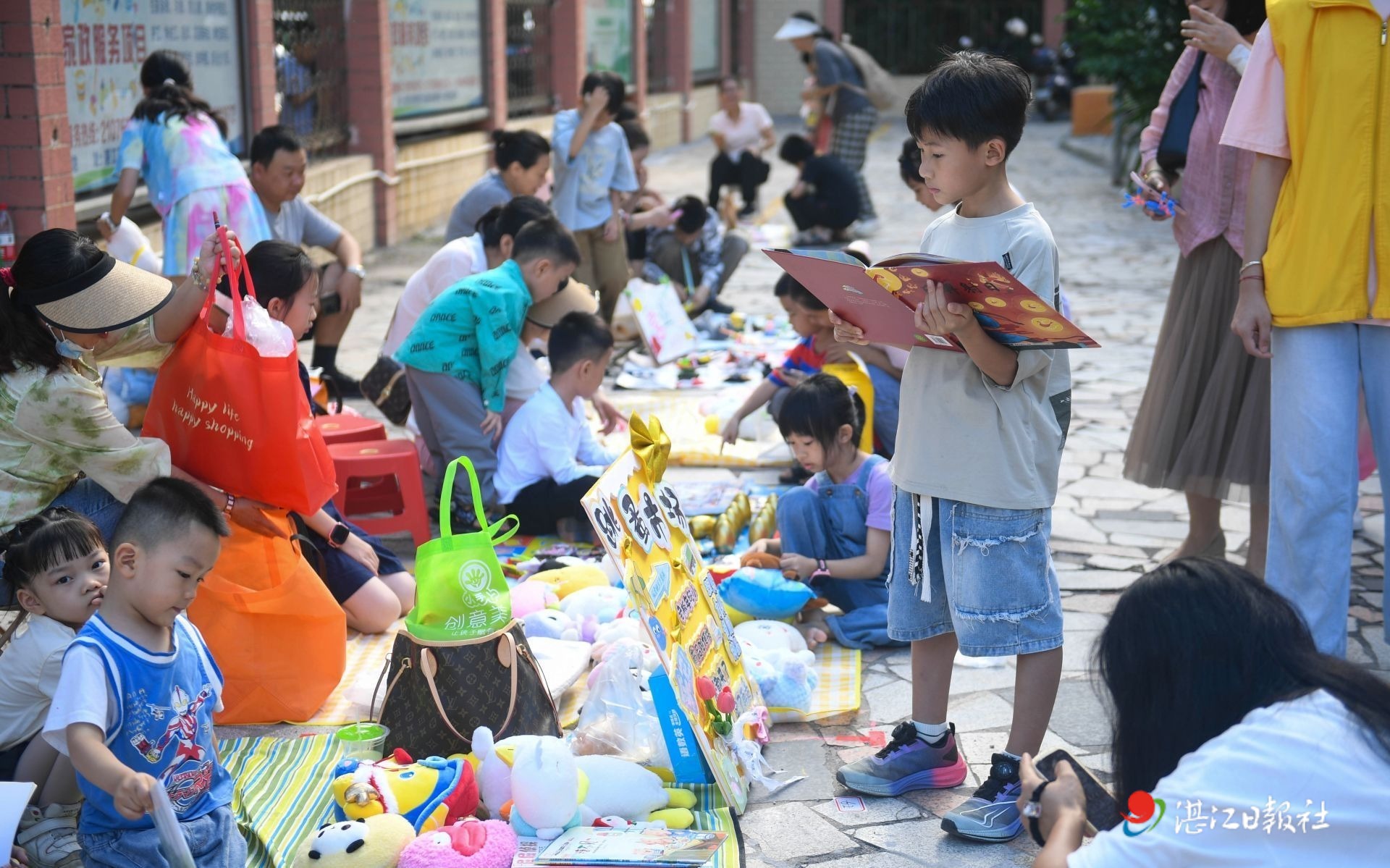 在活動現(xiàn)場,孩子們在家長的協(xié)助下擺開攤位,放上閑置的玩具、文具、書籍、手工制品等,興致勃勃地當(dāng)起了“小攤主”。150余個攤位錯落有致,商品琳瑯滿目。