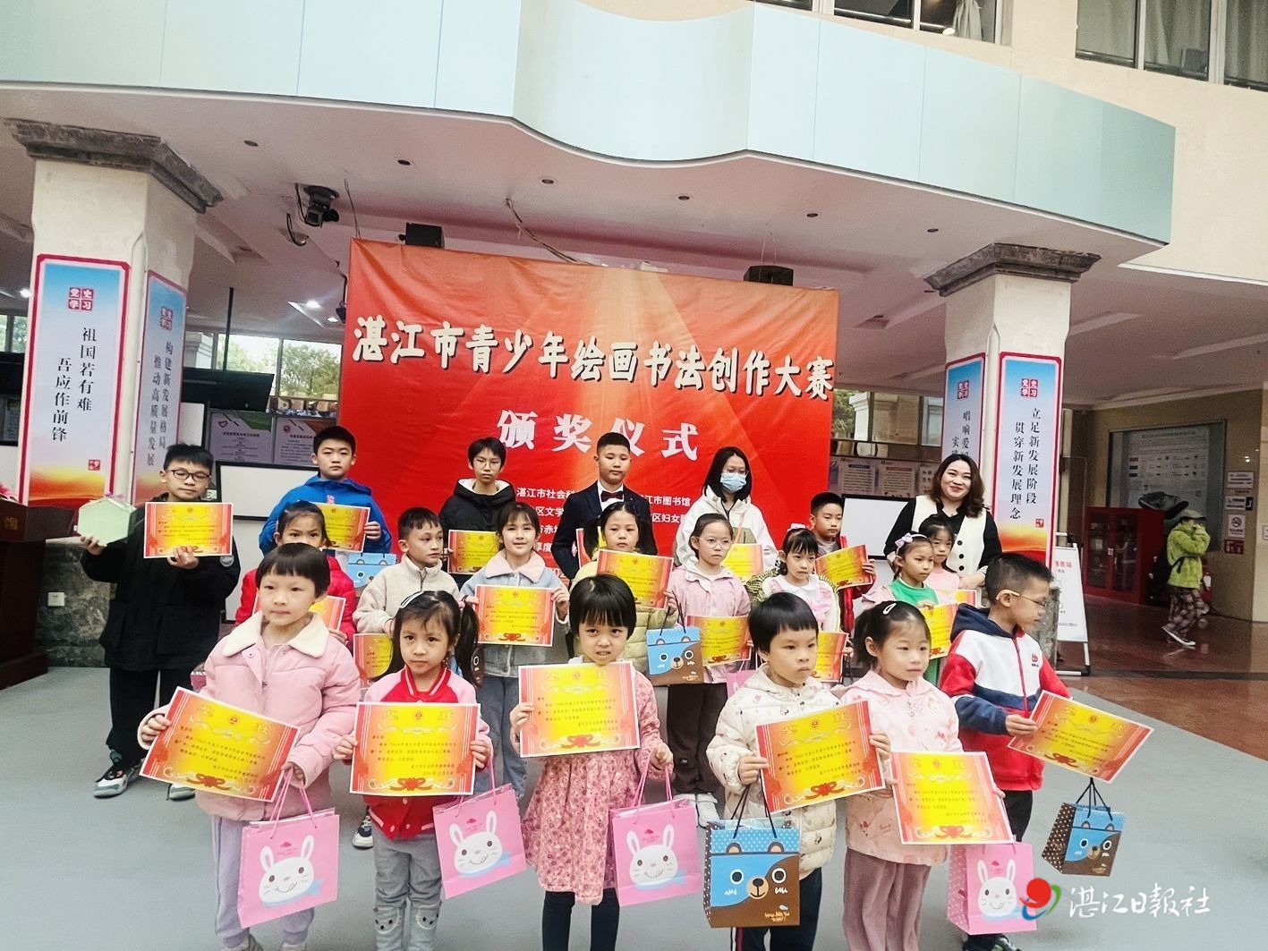 12月14日,湛江市社科聯,市圖書館,赤坎區文聯、區婦聯、區朗誦協會等聯合舉辦的湛江市青少年繪畫書法創作大賽頒獎儀式在市圖書館舉行。