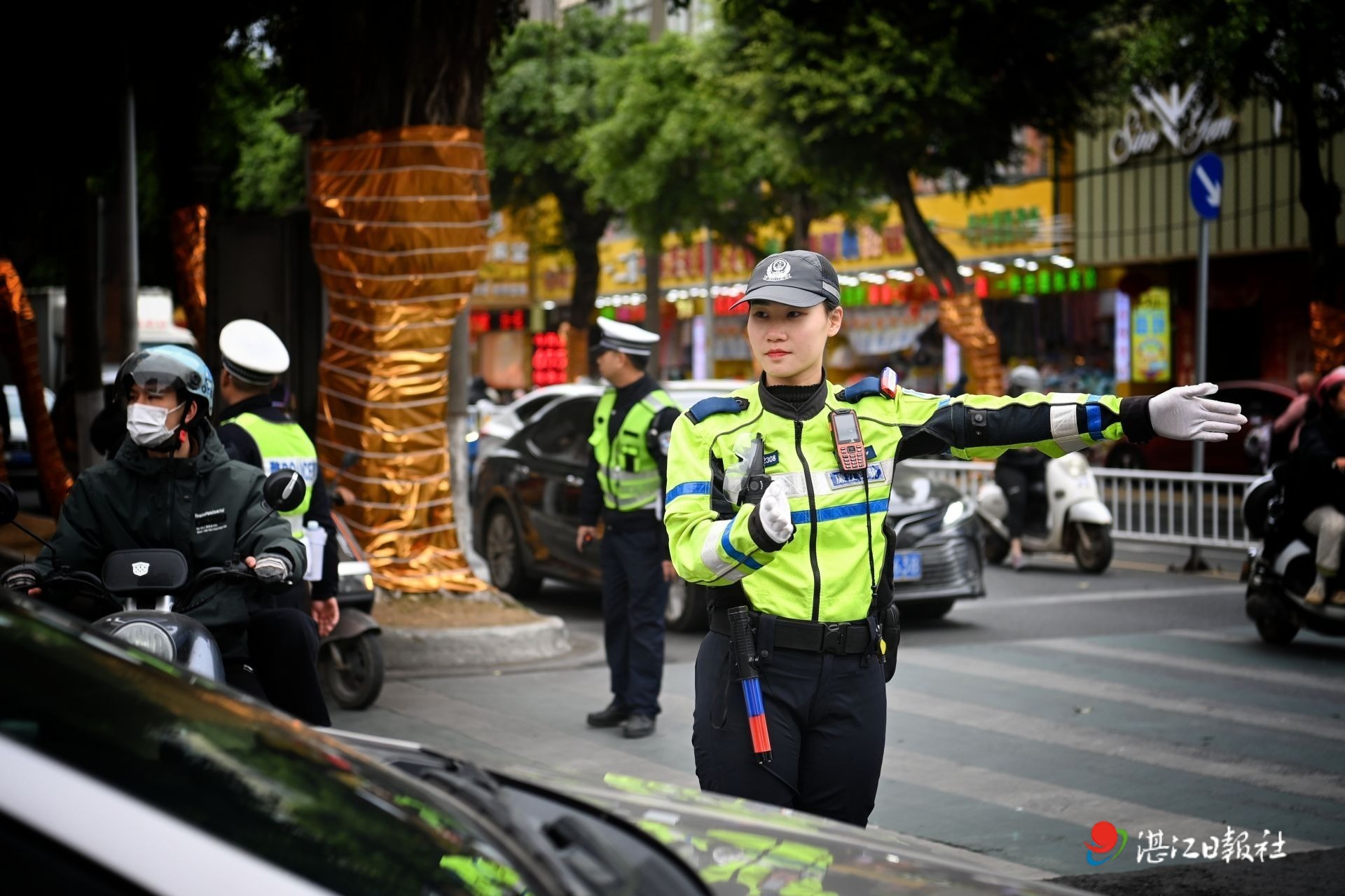 廉江交警在路面執勤,維護交通秩序。記者張鋒鋒 攝