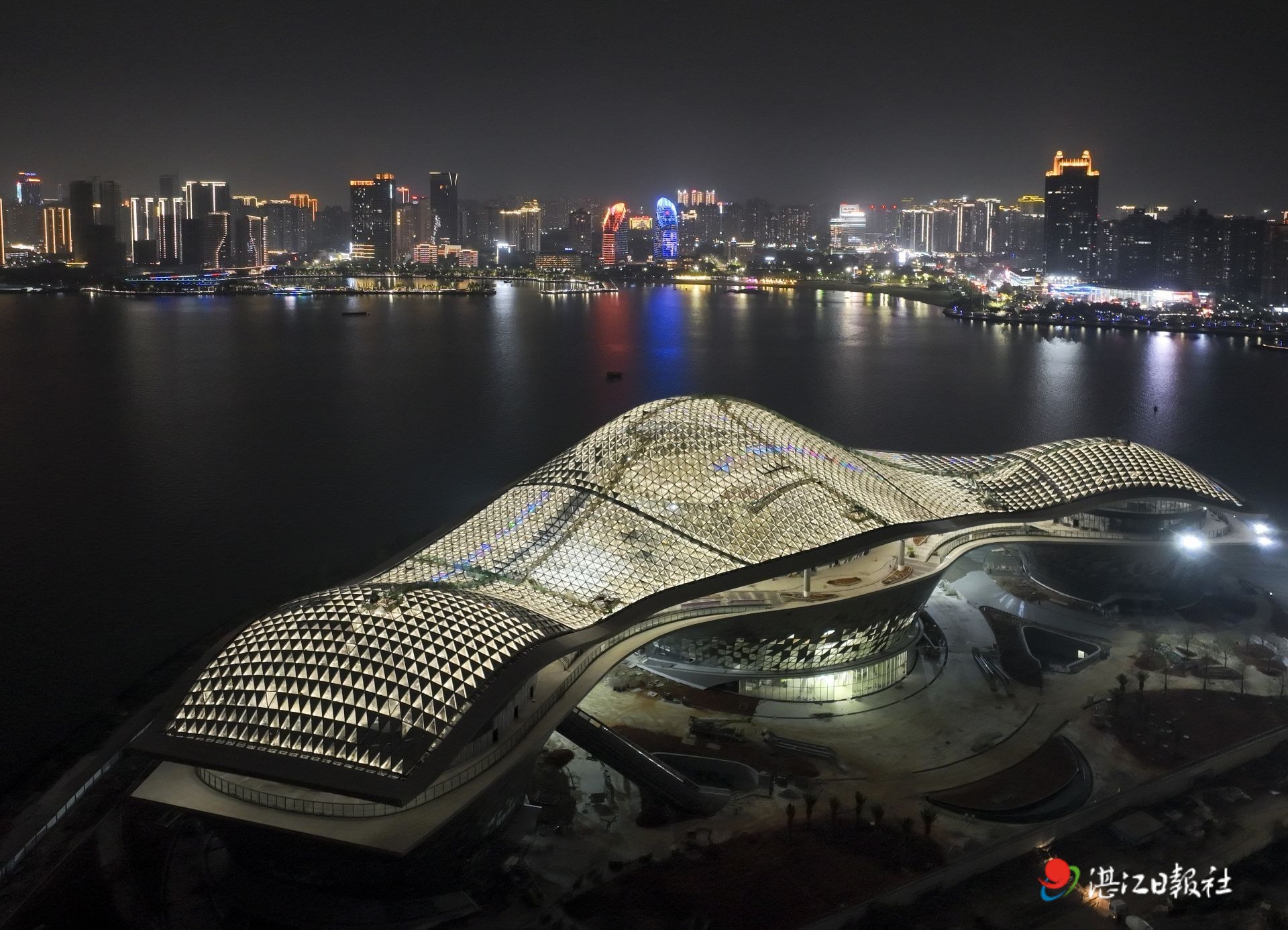 湛江文化中心試燈,點亮湛江灣璀璨夜色。記者張鋒鋒 攝