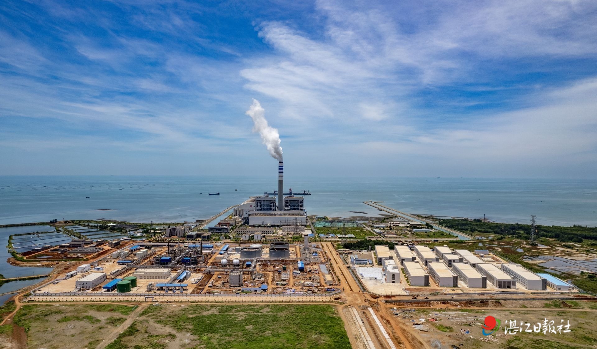 航拍位于雷州烏石臨港工業園區的烏石23-5油田群陸地處理廠區(畫面后面的是大唐發電廠)。記者李忠 攝