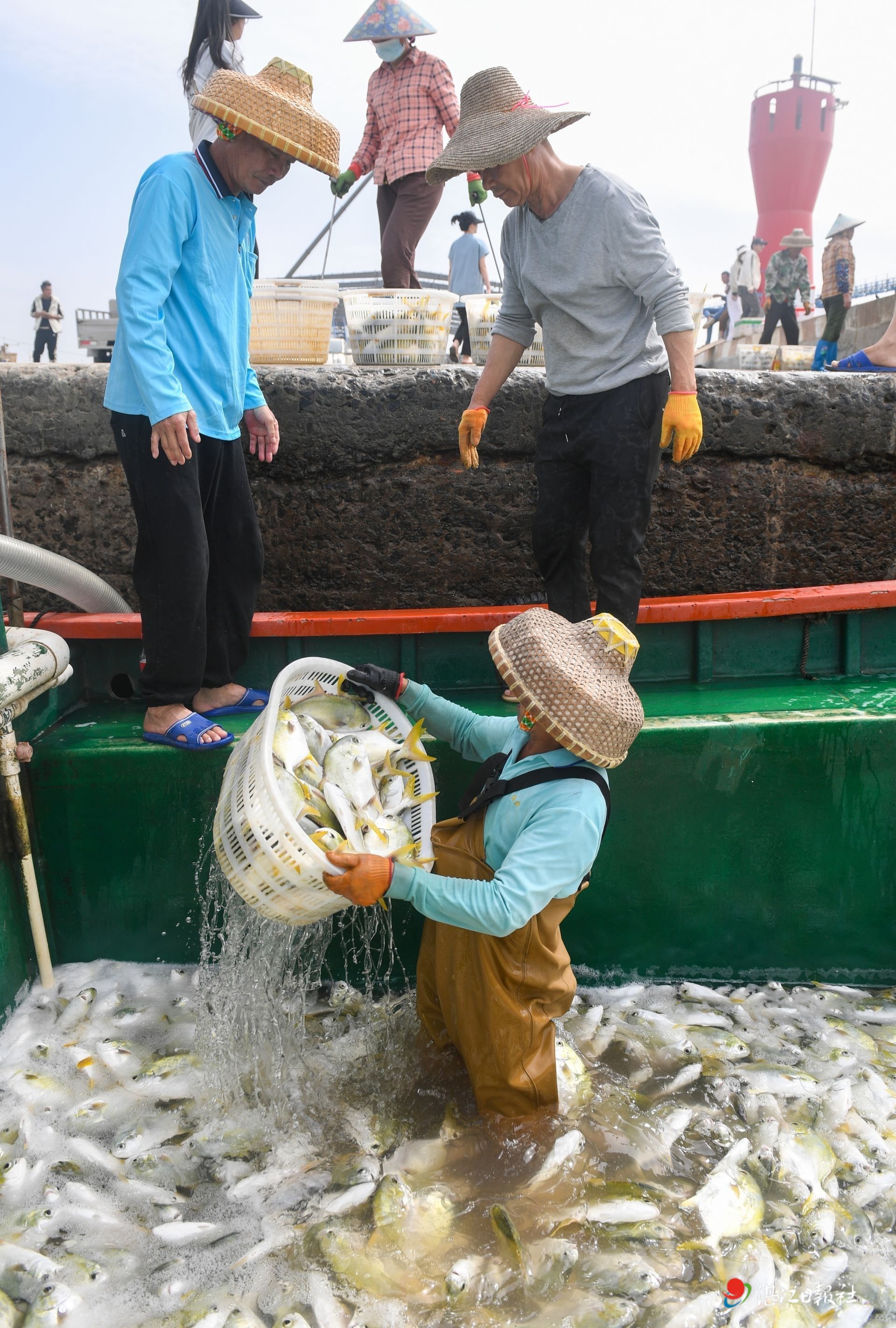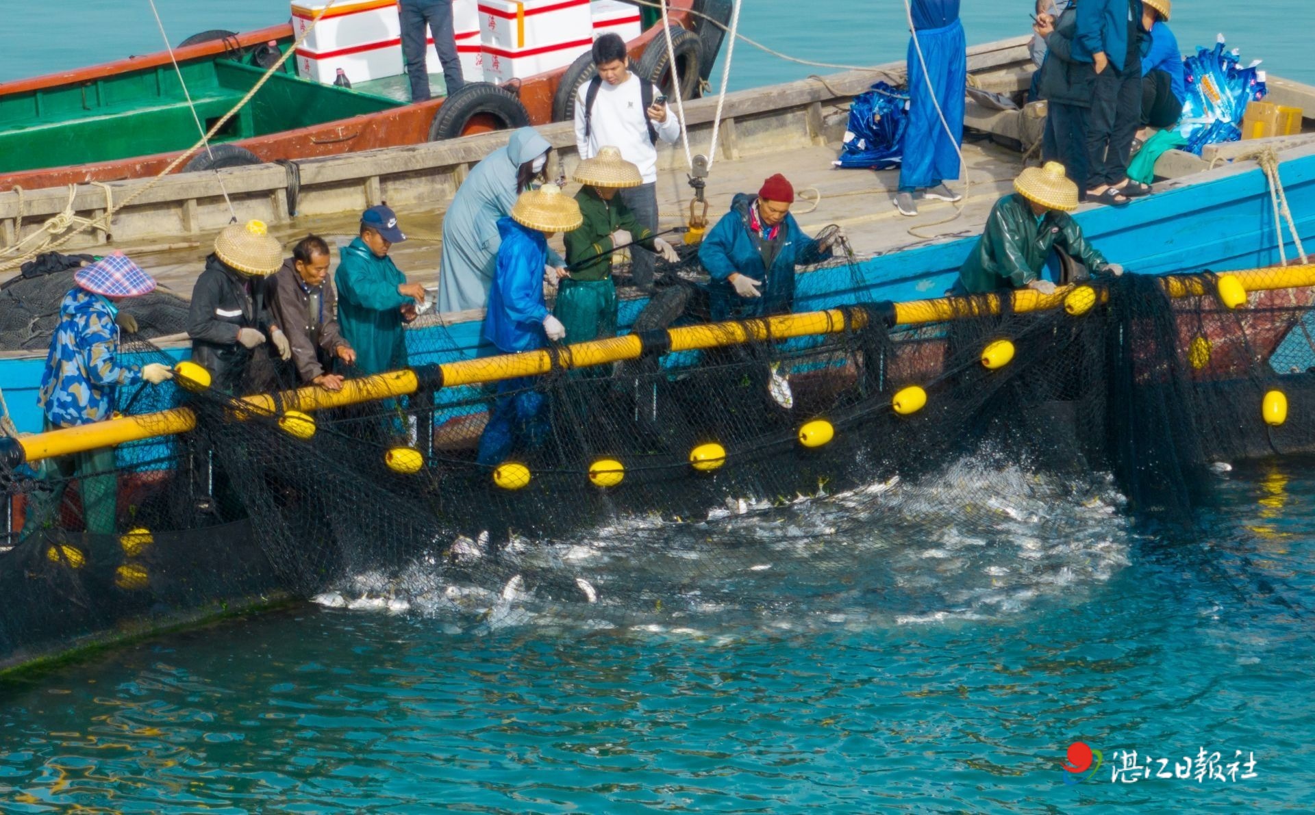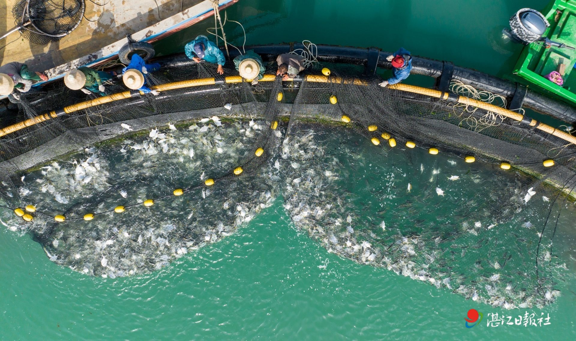 4月14日,雷州覃斗鎮(zhèn)流沙灣海域,南雁海洋牧場的金鯧魚豐收。