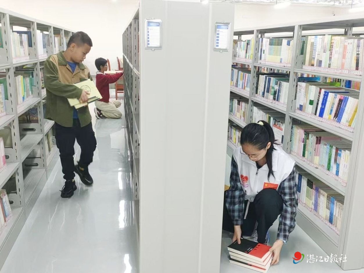 志愿者在赤坎區(qū)文化服務(wù)中心圖書館整理圖書。 通訊員 供圖