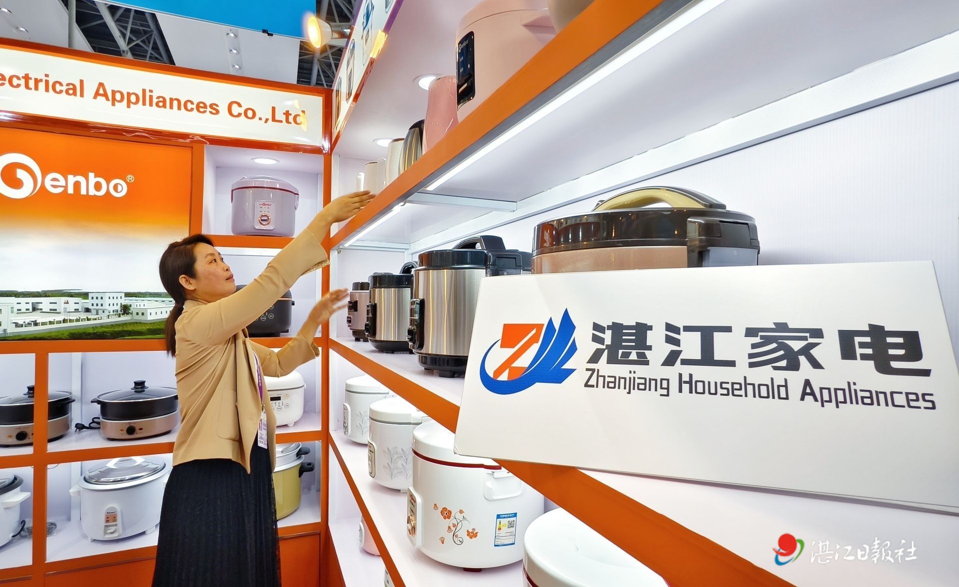 在湛江市湛寶電器有限公司展位,銷售經理鄭東春正忙著與兩位新加坡客商交流,詳細介紹“湛寶牌”系列電飯煲、電熱水壺等產品的特性、亮點。“他們逛到我們展位時,就被我們的鼓形鍋吸引住了,并咨詢了產品的配置、價格等。”