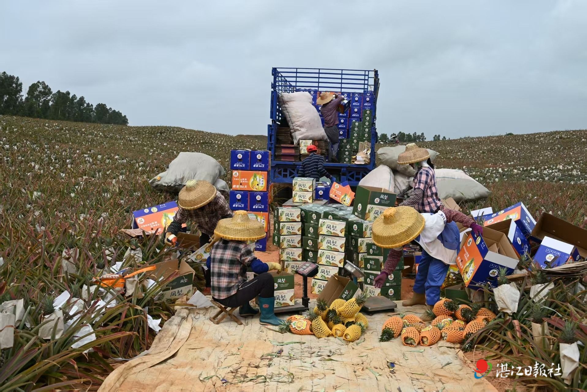 4月15日,在雷州市白沙鎮黎郭東村鳳梨基地,大批工人正在果園里忙碌著采摘鳳梨,一個個碩大的鳳梨,散發出醉人的清香,讓人垂涎欲滴。剛采摘下來的鳳梨被貼上標簽后,裝入紙箱,準備運往全國銷售。