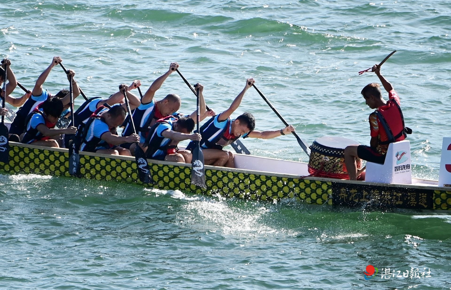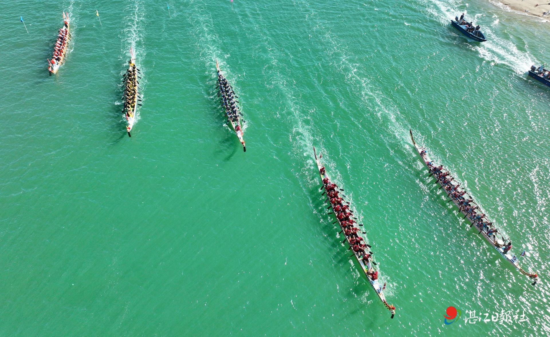 當(dāng)天16時許,隨著一聲令下,江洪漁港瞬間被激昂的鼓鑼聲點(diǎn)燃。在潮漲水滿的北部灣海面上,一場別開生面的海上龍舟賽正式拉開帷幕。來自湛江市總工會、廣西融安縣的兩支隊伍,與江洪鎮(zhèn)8支本土隊伍同場競技。一條條龍舟如離弦之箭,參賽隊員提槳破水、動作整齊劃一,船槳擊水之聲與鼓點(diǎn)共鳴,在海面上劃出一道道蜿蜒波痕。