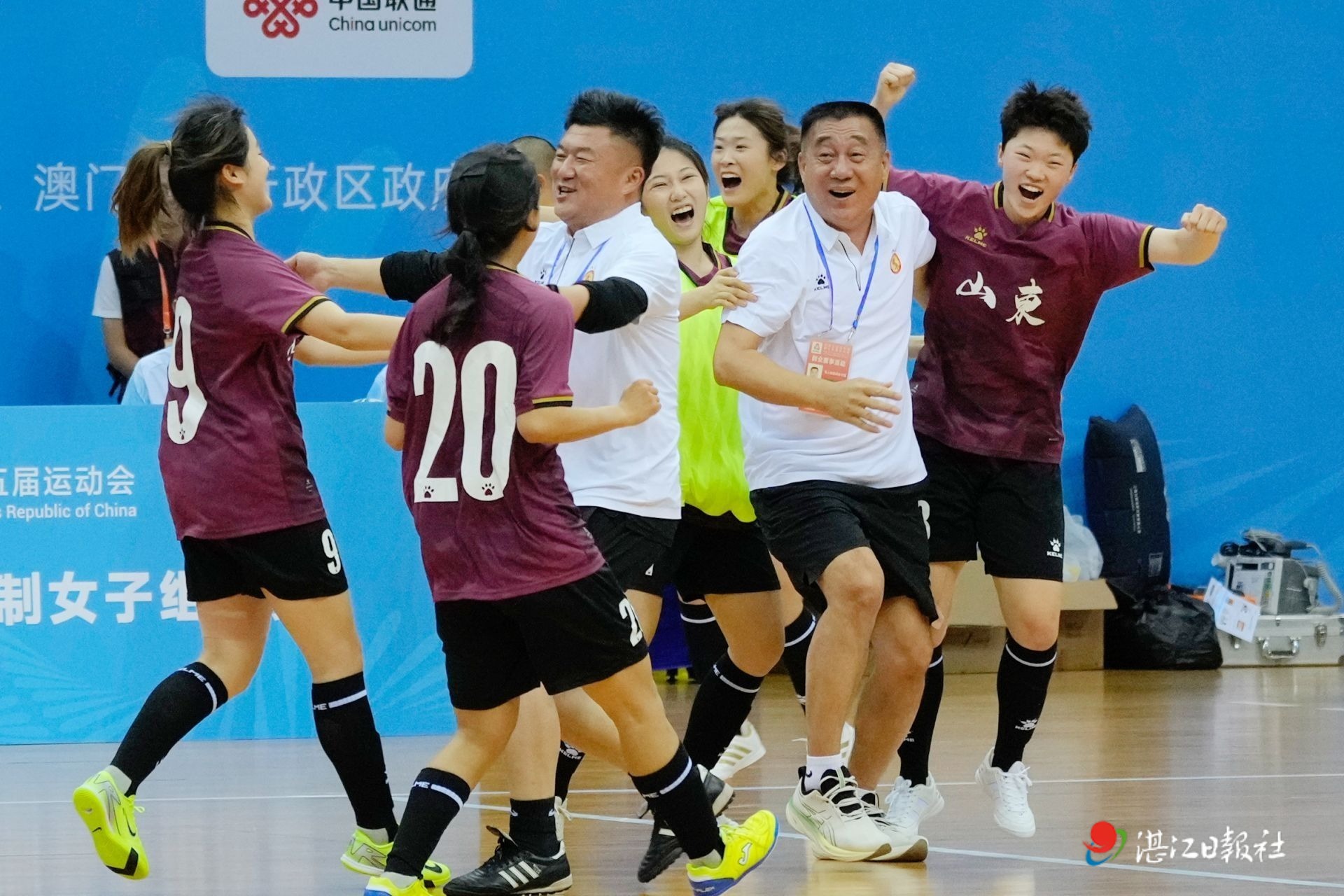 第十五屆全國運動會群眾比賽足球項目五人制足球女子組山東隊?wèi)?zhàn)勝陜西隊后,隊員們教練們擁抱在一起慶祝。