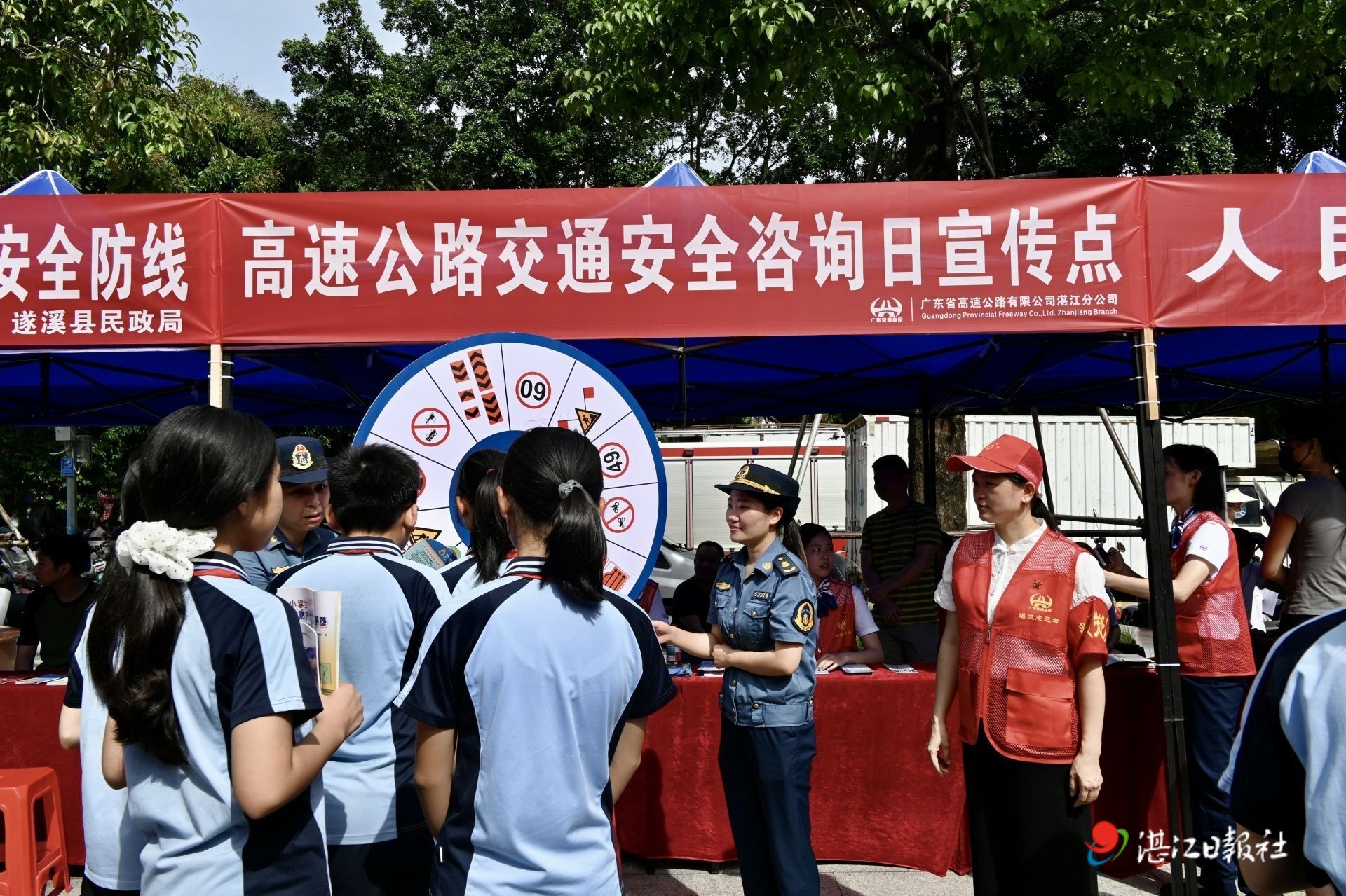 6月19日上午,身著紅馬甲的黨員、湛道志愿者在遂溪影劇院廣場前格外引人注目。在宣傳咨詢區,志愿者們通過展示事故案例展板、發放安全教育宣傳單等方式,用通俗易懂的語言向市民講解ETC使用、高速公路安全行車知識及公路法律法規等,通過面對面“零距離”現場答疑,進一步提升了廣大群眾的交通安全意識。