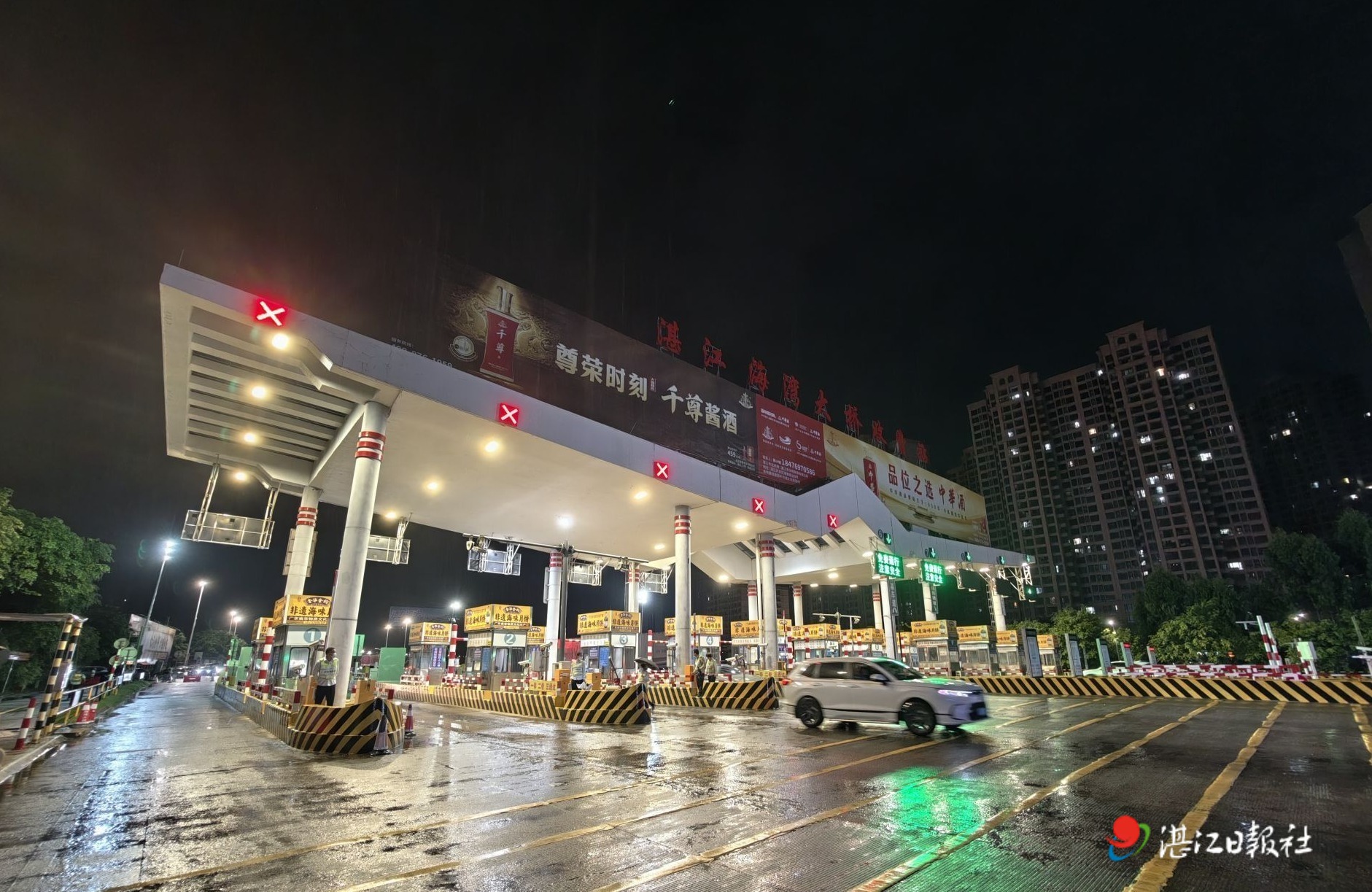 7月1日00:00,在淅淅瀝瀝的小雨中,湛江海灣大橋收費站14道閘桿齊刷刷拉起,如同向市民和游客敞開歡迎的臂膀。一輛輛過橋車輛“順滑”通過,標志著湛江海灣大橋告別18年的收費歷史,正式邁入“免費時代”!