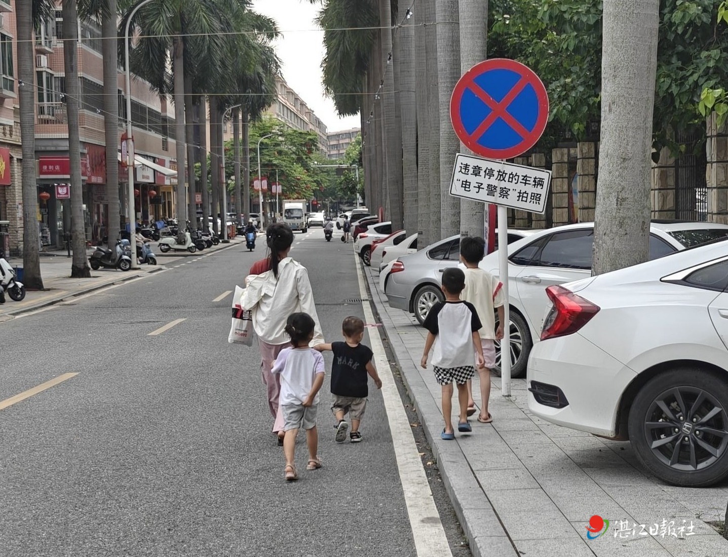 7月10日至11日,記者多次到百姓東三路現場走訪看到,約200米的人行道上停了多輛轎車、電動車,高峰期停放車輛近30輛,將人行道完全堵塞。該路段鄰近湛江市第二小學和百姓風情夜市街,人、車流量大,但道路僅有兩車道,人行道狹窄。行人被逼無奈只能繞行機動車道,與車流混行,安全風險陡增。