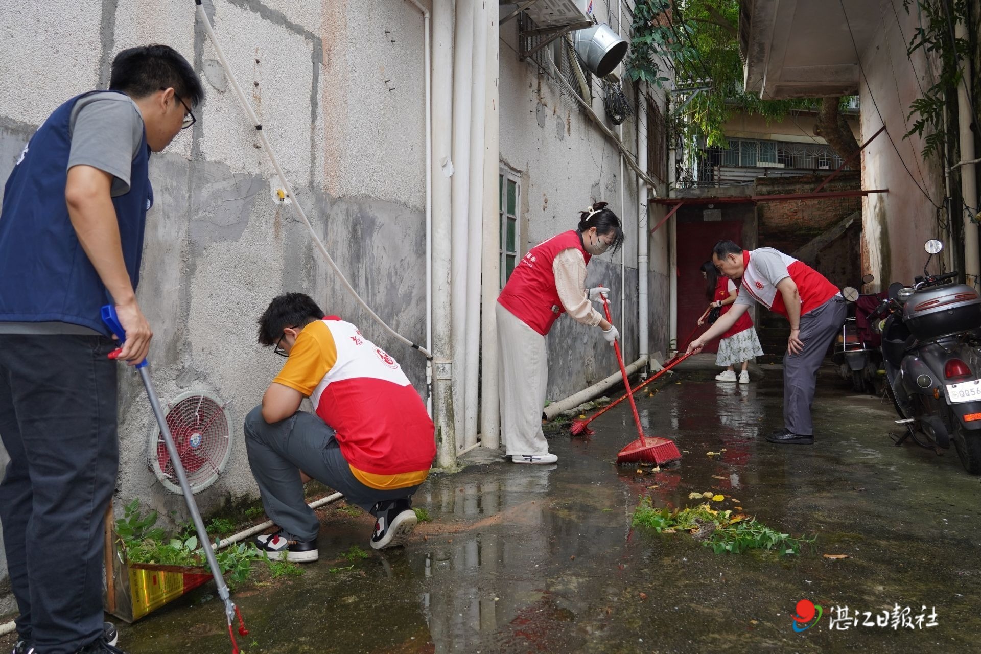 霞山區建設街道的“黨員先鋒隊”和“紅色網格員”身著紅馬甲,成為老舊小區攻堅主力。他們深入掛點區域,逐樓逐戶排查陽臺花盆、空調外機托盤、下水道口等易積水點,拿起清潔工具清掃衛生死角,合力搬移墻角堆積的破舊家具、朽爛木板等雜物。