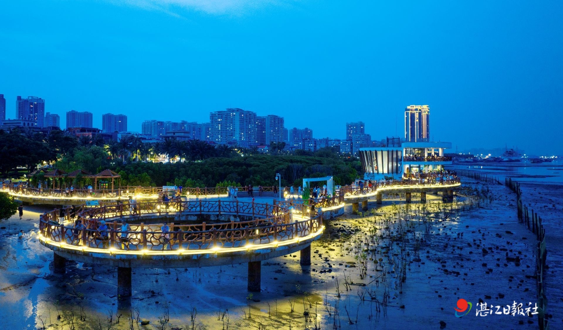 夜幕下的霞山觀海長廊紅樹林與海洋科普館。
