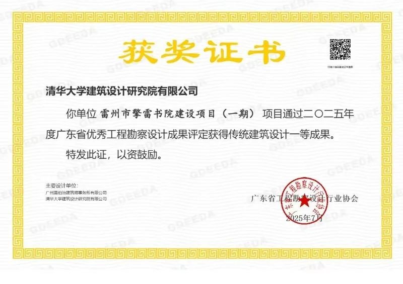 據了解,廣東省工程勘察設計行業協會組織專家于6月28日至30日通過線上評審的方式對2025年度廣東省優秀工程勘察設計成果進行初評,并于7月4至5日在清遠市召開了線下綜評會議。本次評定邀請了省內外共10位全國工程勘察設計大師,以及多位省級勘察設計大師在內的200多名行業專家擔任評委,最終評出優秀工程勘察設計成果749項。雷州市擎雷書院獲2025年廣東省優秀勘察設計傳統建筑一等獎。