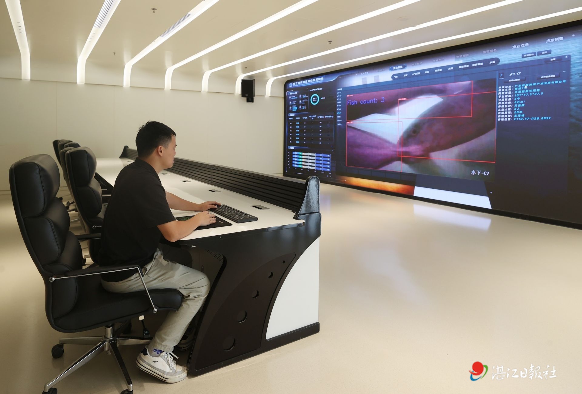 湛江灣實驗室大屏幕上AI會自動鎖定每一條游弋的魚,并有相關數據顯示。記者李忠 攝