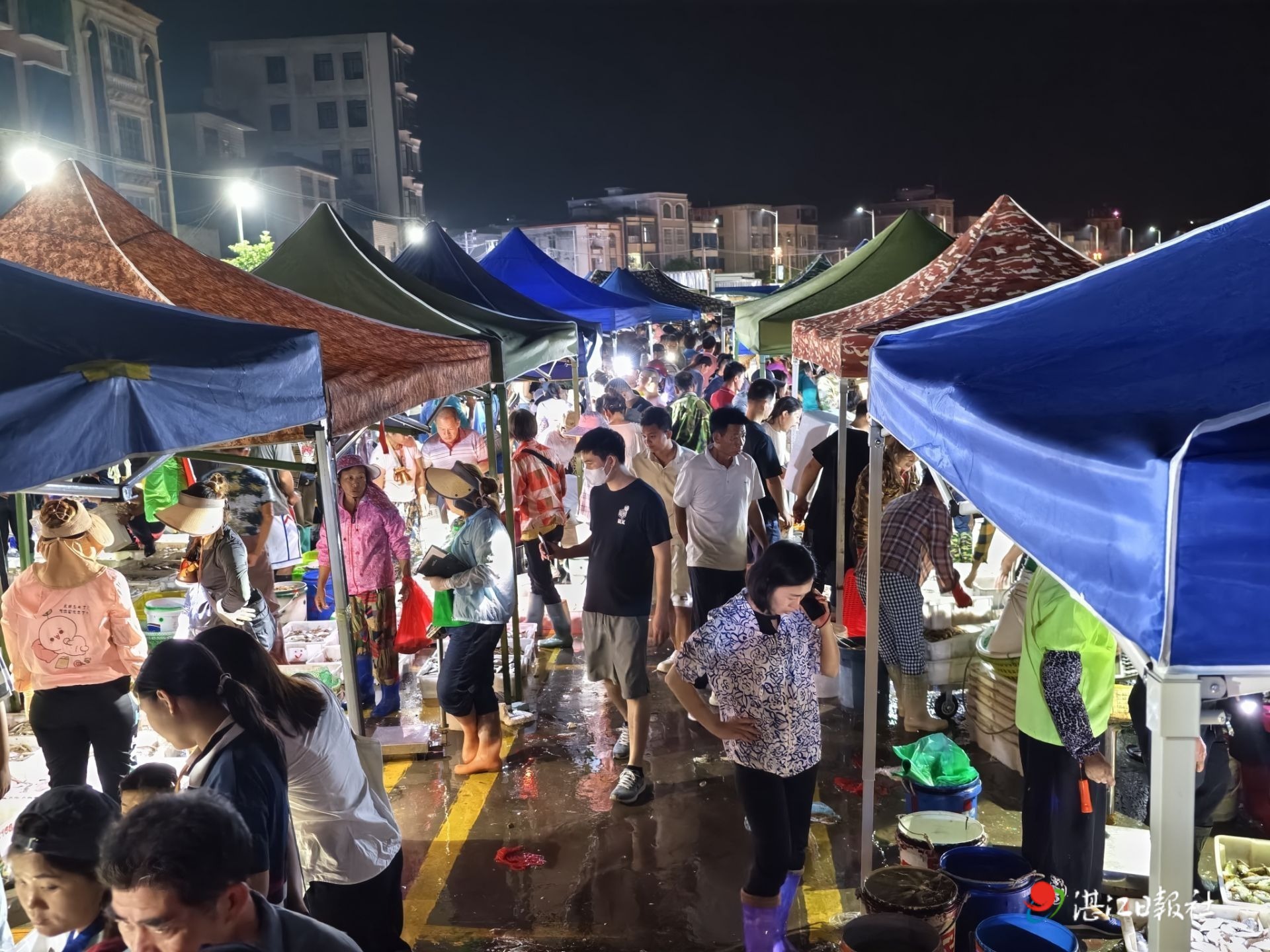 記者在現場看到,明蝦、南美白蝦、黑虎斑、黑鯛、魷魚、花蟹、梭子蟹等海產琳瑯滿目,整齊碼放,價格豐儉由人。碼頭上,“天光魚市”招牌明亮,漁民頭頂照燈忙碌招呼顧客,收購商與食客們則用手機手電筒打光挑選心儀海鮮。來自遂溪的陳小姐提著鼓鼓囊囊的海鮮袋笑意盈盈,她購置了魚、蝦等多種海產,打趣道“微信余額還充足得很”;麻章的左女士凌晨2點便驅車趕來,以35元一斤的價格買下26斤螃蟹分贈親友,直言“第一次來就趕上新鮮海貨,值了!”