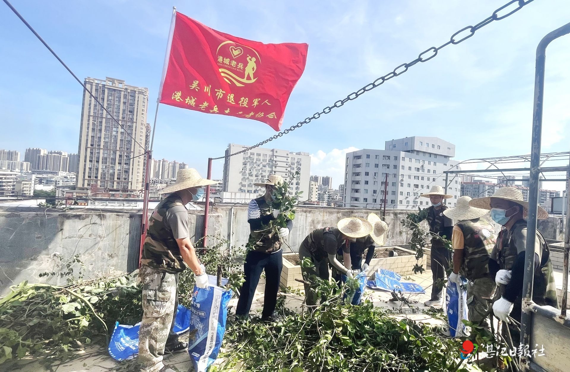 老兵志愿者在樓頂清理雜草。 記者殷翊展 攝