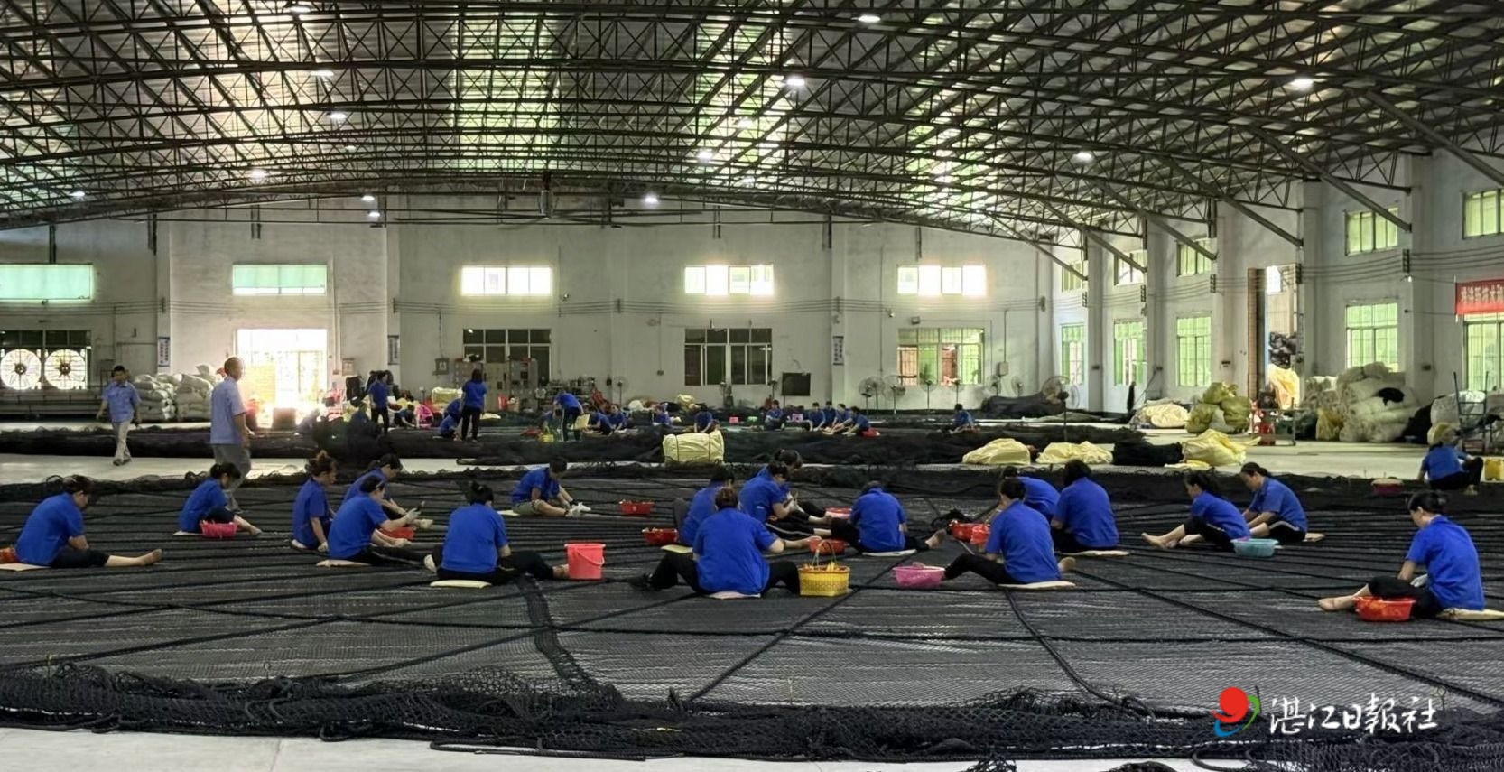 步入湛江經緯實業有限公司漁網機械化生產車間,編織機高速運轉,漁網沿流水線平穩前行,工人們專注檢查每一道工序。