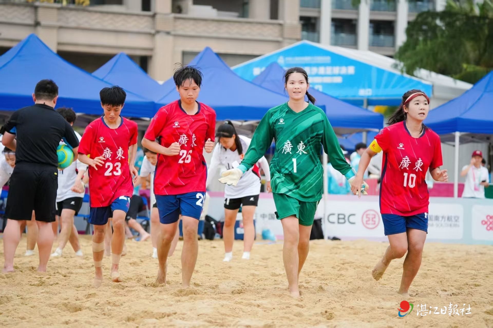 廣東隊1號守門員鄭海鳳(穿綠色球衣者)在十五運沙灘足球比賽中。