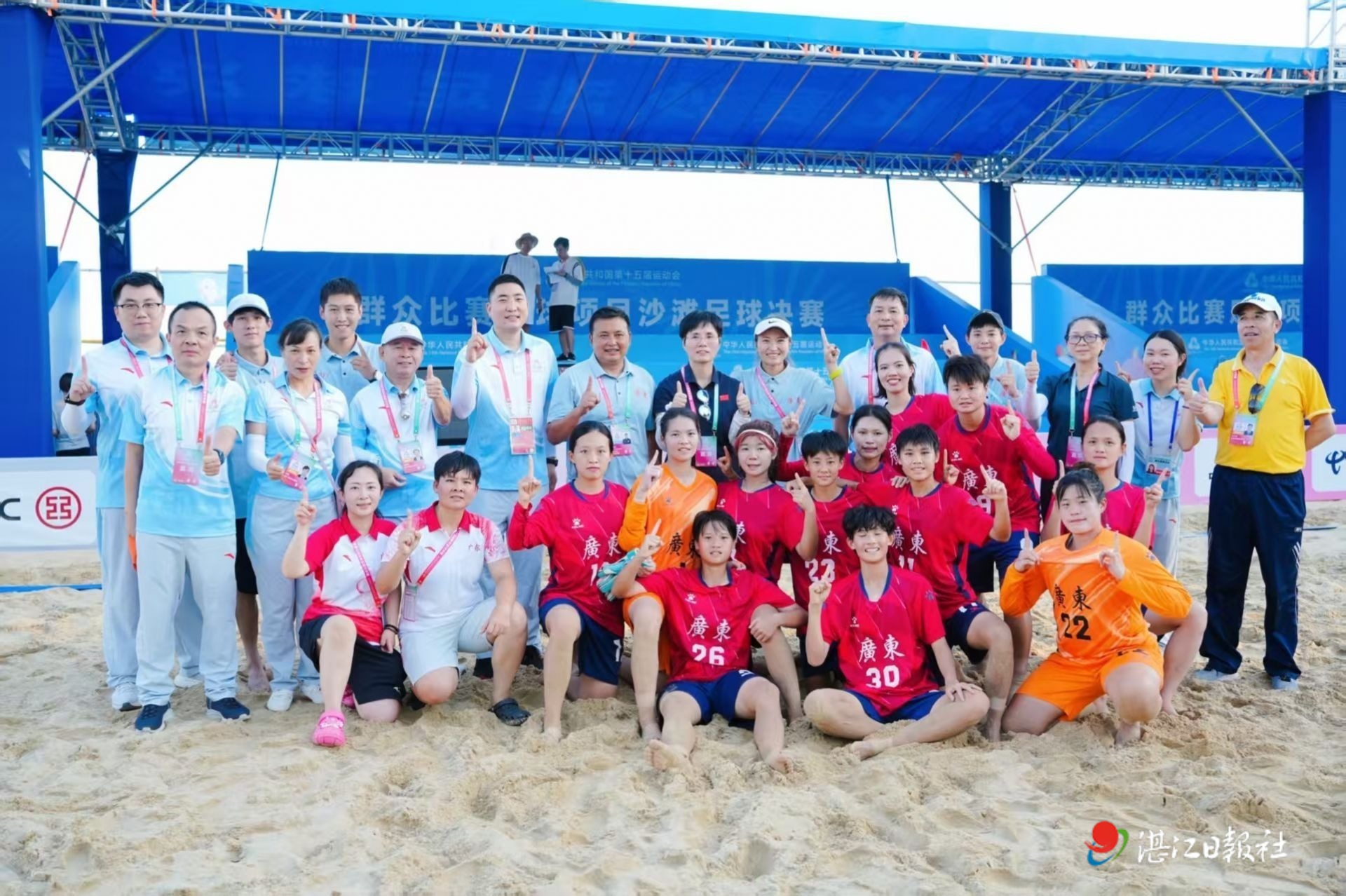 廣東隊奪得十五運沙灘足球女子組冠軍后,1號守門員鄭海鳳(穿橙色球衣者)興奮地留影。