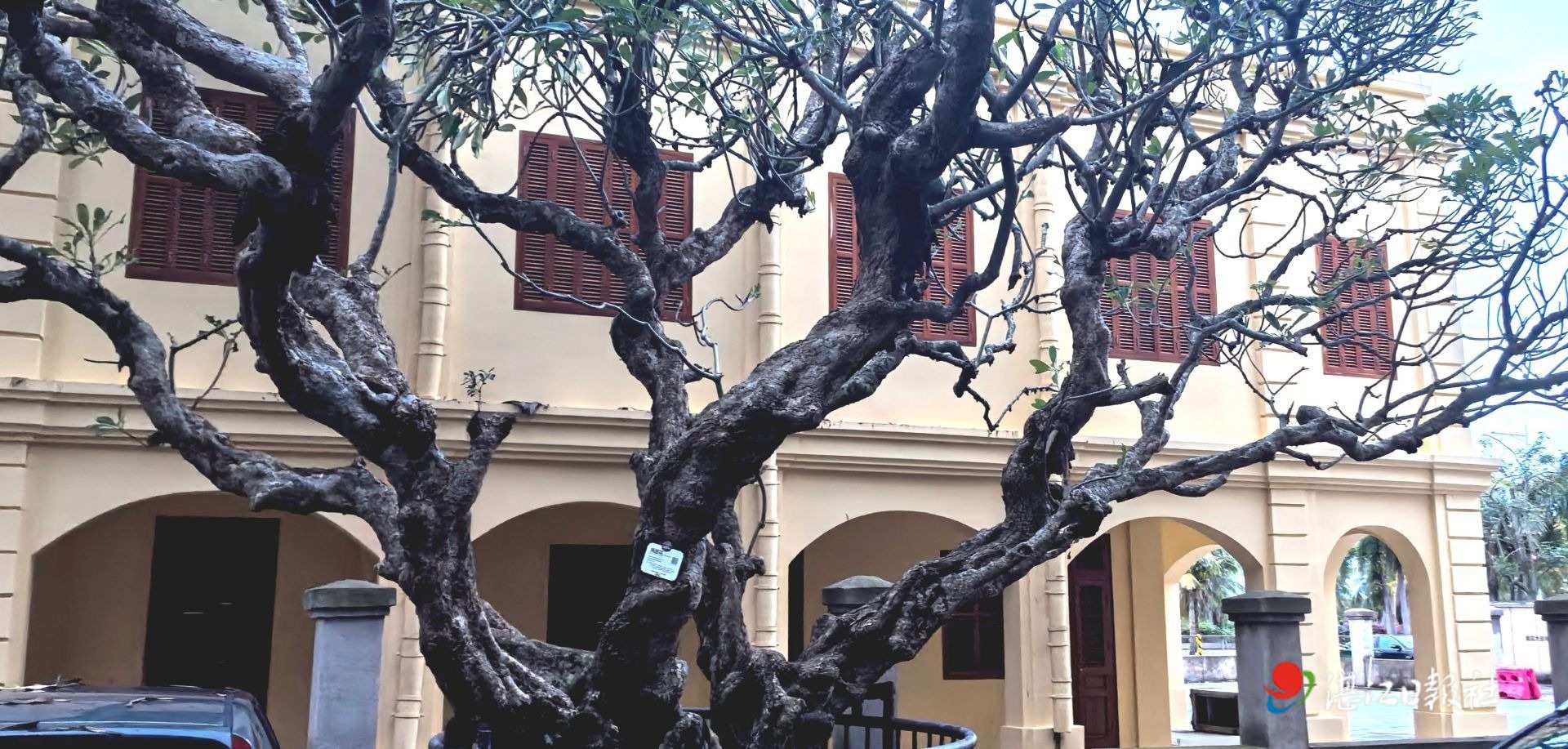 在湛江,雞蛋花是家喻戶曉的風景樹。從廣州灣時期開始普遍栽種。在本地的景區和公園,甚至在機關學校和新舊樓盤,到處可見雞蛋花樹的蹤跡。其中最老的一株位于霞山區海濱大道南的“西營電報樓”舊址后側,栽于1903–1908年間,樹齡已超110年。其樹冠龐大,枝干蒼勁如鐵,這是我見過的最有歲月感和生命張力的雞蛋花老樹。