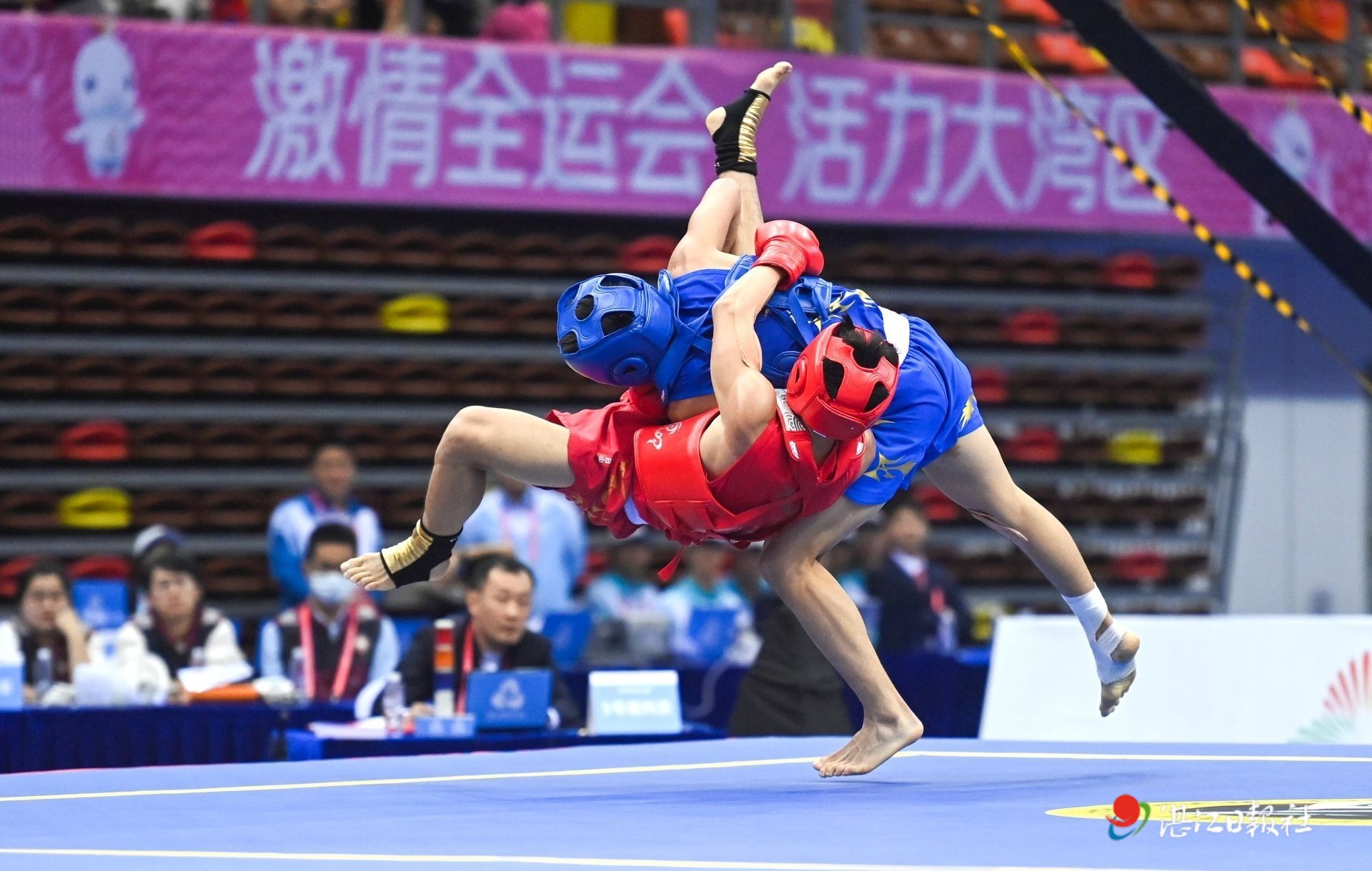 十五運會武術散打男子60公斤級決賽,江蘇隊唐思碩(藍方)2:1戰勝福建隊的黃家駿,奪得冠軍。
